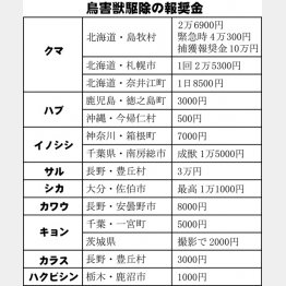変わり種としては、小型のシカで特定外来生物のキョンの捕獲に千葉県一宮町は1頭当たり5000円を支給。また、茨城県はキョンの県内侵入を防ぐため、4月以降に撮影されたキョンの生きている画像や動画に情報料として2000円を支給する。さらに許可された者がキョンを捕獲した場合は1頭当たり3万円の報奨金を出す。