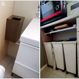 一方、洗面所ではゴミ箱のリフトアップに2本の棒を使っていた(写真(G))。「箱を浮かせることで掃除がしやすい」とは名案だろう。箱は丸より四角い方が安定する。
