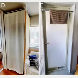 スゴイ! と思ったのは写真(D)。つっぱりポールとカーテンなどを組み合わせた自家製倉庫だ。トイレットペーパーなどを置いているという。