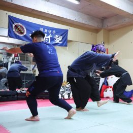 道場での稽古が終わった後、習志野師範が「骨固め」を披露してくれることに。おもむろに立ち上がって肩幅ぐらいに足を開いた習志野師範が「どうぞ(蹴って構いません)!」とひと言。失礼して股間を蹴り上げると、師範は「全然、大丈夫です」と笑っていた。