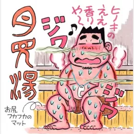 ストーブ横にはテレビが静かに流れ、そのそばにはデジタル時計。香太くんも相まってヒノキチオールに癒やされながら、のんびり汗を流すと、2分ほどでボタボタと玉汗が滴り落ちてきた。砂時計はクリアして、1セット目は7分で全身滝汗状態になりギブ。くぅ~、ガッツリ熱いっス。