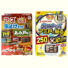 どちらもマジックテープを網戸にぺたっと貼るだけ、2個入りです。アースは365日用、キンチョーは250日用を選びました。値段は、ドラッグストアでアースが1178円(税込み)、キンチョーが1037円(同)です。