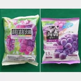 今回は、同じぶどう味で比較します。マンナンライフの「蒟蒻畑」とORIHIRO(オリヒロ)の「ぷるんと蒟蒻ゼリー」です。