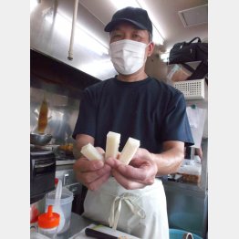 お店の人に聞くと1番人気だという。早速ビールと一緒に注文。口に運ぶとアツアツのうえサクッとした食感。ソースをかけなくとも味がしっかりしみ込んでいて、ビールとの相性もバッチリ!