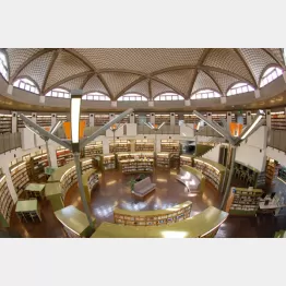 圧倒されるのは外観だけではない。2階建ての館内は中央が吹き抜けになっており、その高さ13メートル。円形の壁面は上から下まで全部が書架、さらに同心円状に重ねて書架を配置しているので、歩いていると本の回廊に迷い込んだような錯覚に陥る。