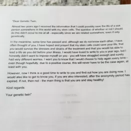 ドナーは「ドイツに住む男性」とだけ知らされ、他の個人情報は明らかにされていなかったが、女性は先日、カナダ血液サービス経由でドナーから手紙を受け取ったという。