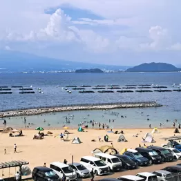 伊豆半島の西側の付け根に位置する「沼津らららサンビーチ」には、「練馬」「前橋」などのナンバープレートが並び駐車場はほぼ満車の活況。家族連れを中心に約500人ほどが訪れ、バーベキューや磯遊びを楽しむ穏やかな時間が流れていた。