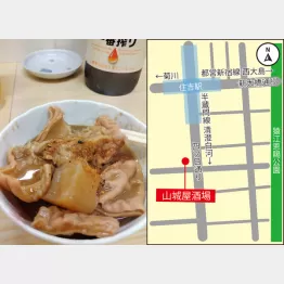 カウンター内の別の女性が笑顔で「のどカラカラじゃ、ビール?」。「一番搾りの大瓶を(650円)」。下町女は筋を通せば優しいのだ。ビールで人心地つき、壁の品書きを見るとこれぞ酒場の肴というものばかり。子供が欲しがるのは鳥の唐揚げぐらいだろう。早速、煮込み(450円=写真)と焼きはんぺん(450円)でスタート。煮込みはテッポーと呼ばれる分厚いモツが、ちょうどいい歯ごたえに煮込まれている。