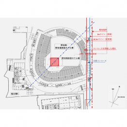 図の青の実線が従来案、赤の実線が見直し案だ。正面スタンド裏に併設されるホテル部分を優先する構造のため、従来案でも外野席は現行の最大48列から27列まで減るとみられていた。見直し案では外野のライトスタンド部分がさらに削られ、単純に線を引くと、事業者が再開発の売りにしてきたコンコースやテラスが切り取られてしまう。