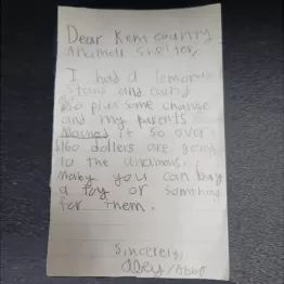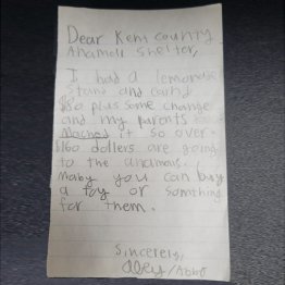 手紙には、アビーという女の子がこの夏のレモネードスタンドの売り上げ80ドルをKCASに寄付することを決め、それに賛同した両親が娘と同額の寄付をすることにした経緯が記され、「動物たちにオモチャか何かを買ってあげてください」と書かれていた。