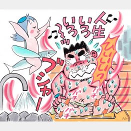 昭和歌謡が流れる脱衣場で服を脱ぎ、浴場にお邪魔すると、愛らしいカッパが戯れるタイル画がドーンと女湯まで広がっていた。その姿に黄桜のカッパCMを思い出したぞ。なつかしさにひたって、用意されたリンスインシャンプーなどで汗を流す。手ぶらOKはありがたい。