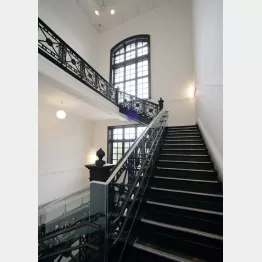 上階へといざなう大階段(写真③)は思わず見とれる荘厳さ。1階から3階まで20メートルの吹き抜けで、手すりは鋳鉄製とのこと。そして2、3階の廊下との間には創建当時から残るケヤキ材の大きな扉(写真④)が。中でも見どころは2階の児童書ギャラリーで、かつての「特別閲覧室」(写真②)だったそう。室内の漆喰で仕上げた白い4本の柱が当時の趣を伝えており、感嘆する。