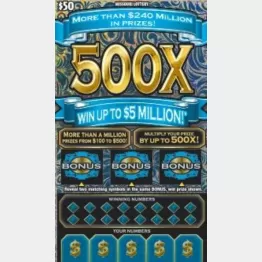 呼び出しを受けて男性はしぶしぶ車で職場に向かったが、途中でガソリンが少ないことに気がつき、同州ペリービルのコンビニ兼ガソリンスタンドの「ケイシーズ」に寄った。そして給油のついでに、50ドル(約7500円)で最高賞金500万ドル(約7億5000万円)のスクラッチくじ「500X」(写真)を買ったのだ。