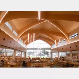 「この地は隠れキリシタンと深いつながりがあります。そのため、教会で見られるコウモリ天井を取り入れました。天井の高さは最大約7.6メートルで、そこに立体感が加わることによって非常に開放的です。天井と書架には五島列島産の木材を使用し、さらに東側と北側の壁の上部に設置された天窓からは自然光が差し込むため、全体的に温かみのある雰囲気に包まれます」