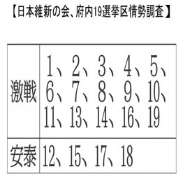 吉村知事の女性人気は健在らしいが、維新は牙城すらグラグラだ。政党や各メディアの情勢調査などを見ると、府内19選挙区のうち維新候補が安泰なのは幹部の地盤である12、15、17、18の4選挙区のみ(別表)。激戦が実に15選挙区にも上る。