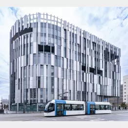 「外壁はアルミ、ガラス、御影石のパネル約1000枚を組み合わせたものです。アルミとガラスは富山を代表する産業で、御影石は旧富山第一銀行本店の外壁と同じ白い御影石を使用しています」(富山市立図書館本館の工藤崇人さん)