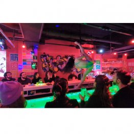 息をつく間もなく今度は「ショータイム」に突入。筋肉女子がポールダンスを実演したり、客も総立ちになって一緒に筋肉ダンスを踊ったりと刺激的な時間が続いた。