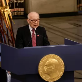 ノルウェー・オスロ市庁舎で10日行われたノーベル平和賞授賞式。その壇上で日本原水爆被害者団体協議会(被団協)代表委員の田中煕巳さん(92)は、現在も続くウクライナ戦争におけるロシアの核の威嚇やイスラエルの核兵器使用の懸念について冒頭のように力強く語った。