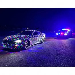 クリスマス用にカラフルなイルミネーションで飾り付けられたフォードマスタングが、警察車両によって停車させられている写真だ。とてもきれいだけど、同州では、警察車両や救急車、消防車などの緊急車両以外、赤や青の灯火を車両に付けることは違法。不要な混乱や危険を防止するためだ。