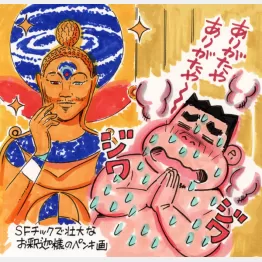 ドアを開けると、心地よい熱さに包まれた。2つの照明が明るく照らす室内はヒノキ造りで88度。2段ベンチは、上段ストレート、下段L字で定員8人。ワッフル生地のマットがきれいに敷かれ、上段にどっこいしょすっと、おおおーー、天井でお釈迦様が見守っているではないか! 宇宙をバックに金色で。いつも以上に真剣に熱波を頂戴しよう。