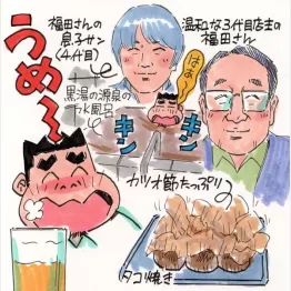 服を着てフロントでキーを返すと、広めの食堂でご褒美の一杯。パスタや蕎麦などが並ぶメニューから生ビール480円とタコ焼き250円をチョイス。これまたキンキンの黄金液体で喉を鳴らし、濃厚ソースでカツオ節たっぷりの1つをパクリ。くぅ~、この香ばしさたまりませんねぇ。