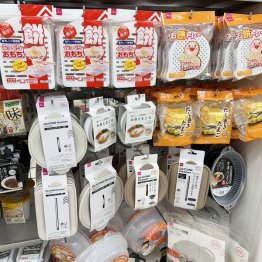 以前、紹介しました即席めんが調理できるラーメン用は、水と麺、スープ、モヤシなどの具材を入れてチンするだけ。こんな感じで、いろいろと調理できるグッズがずらりと並んでいます。