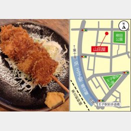 なるほど。じゃ、ぬる燗1合(350円)と串カツ(300円=同左)。串カツと日本酒は相性がいい。長ネギ入りの関東風がいいね。まずはぬる燗をぐびり。うん。間違いなくうまい。で、串カツを肉ネギもろともバクリ。これもサイコ~。次は少し熱めを頼むことに。するとかわいいお姉さんが一合徳利の酒を2回、酒燗器にくぐらせた。なるほど。ぐい飲みにつがれたお酒からはほのかに湯気が立ち、口を寄せても湯気でむせることもなくちょうどいい熱さ。うまいなあ。