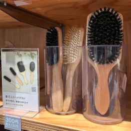 私が気になったのは、「豚毛入りヘアブラシ」(300円)。これ、どう見ても1000円はするでしょうと、値段を二度見してしまいました。このお店のいいところは、商品サンプルが出ていて実際に手に触れて試せること。ヘアブラシもどんな感じなのか手に取ることができるので、失敗はありません。実は、前から気にかかっていて近くにショップができたら見に行こうと狙っていた商品でもあるんです。