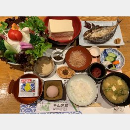 朝食の壱州豆腐は、司馬遼太郎の「街道をゆく」の中に登場する大陸伝来の巨大な一丁1キロもある豆腐です。その固さ、濃い豆の味とコクが特徴。竹の短刀で切り分けて、旅館特製の燻製醤油をかけると絶品です。