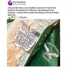 「見つけても持ち主を捜さないでね。このジャケットはあなたのものです! 私はこのジャケットを(イーグルスが優勝した)2018年のスーパーボウルの夜に拾ったんです。そしてイーグルスが再び優勝した今、それを街に戻すべきだと思ったんです。またイーグルスが優勝した時に戻してください。それまではこのジャケットを着ててください。頑張れ、イーグルス!」