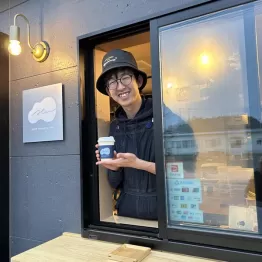 さらに、30秒ほど歩くと水色を基調としたアート作品が描かれた建物があり、その一画で2~3人の年配男性が談笑していた。彼らの目当ては、2月23日に当地で開店したコーヒー焙煎所「open roastery Alu.」がテイクアウト用に販売するコーヒー。皆、提供されるまでの間、「今日は暖かいね」などとおしゃべりしており、楽しそうだ。店主の深沢諒さん(28)が言う。