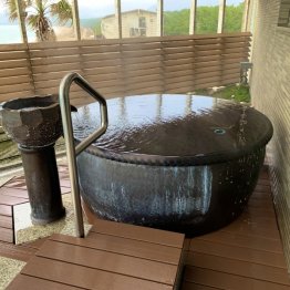 露天風呂の一角にある陶製の湯船は循環濾過をしていない掛け流しで利用しているから、上がり湯に最適です。