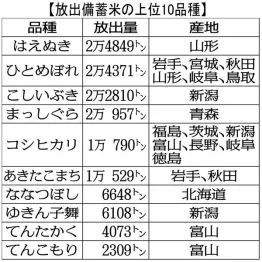 〈別表〉は農水省の入札公告をもとに、日刊ゲンダイが集計した放出備蓄米の上位10品種だ。全国の作付けシェア33.1%(2023年産)で断トツのコシヒカリの放出量は全体の7.2%。人気の新潟産に絞ると、1.8%まで下がる。また、8位以下には全国的には、なじみの薄い品種が並ぶ。