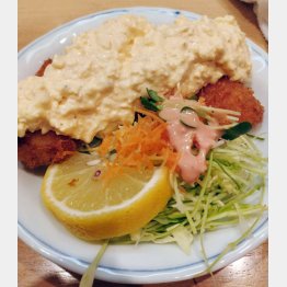 が、メニューを見直すとうまそうなものばかり。まずはサバのニンニク醤油焼き(440円)と海老のすり身揚げ(418円)。脂がのったサバにニンニク風味の醤油がよく合っている。ご飯が欲しくなる味だ。ならば液体ご飯といこう。辛口・玄(286円)の熱燗で体を温め、矢継ぎ早に剣岳の180㏄冷酒瓶(385円)だ。熱々のすり身揚げに冷たい酒がよく合う。よし、カレイフライのタルタルソース掛け(473円=写真上)もいこう! 追加注文が決まったものの、カウンターの常連客の注文が気になって仕方ない。