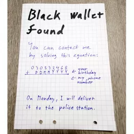 そこで男性は、「黒い財布を拾いました 次の問題を解くと私の電話番号が分かります」などと書いたビラを財布を拾った近くに張った。