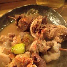 店主の草野英雄さんは新宿思い出横丁のささもとで修業し、18年前にこの地でささやを創業。1階は7、8人座れるL字カウンターだけ。アタシはその中央に陣取り、まずはホッピーから(550円)。ツマミは名物の煮込み(726円=写真左上)。ここの煮込みは串に刺したモツを大鍋で煮込んだもの。3種類の串煮込みが平皿に盛られて出てくる。