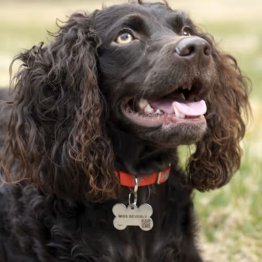 ペットスクリーニング社が2022年6月にスタートしたサービスで、飼い主はまず「ファイドアラート」の公式サイトにアクセスして、無料のアカウントを作成。愛犬の名前、性別、写真、連絡先などプロフィルを登録すると、数日後に、郵送で「ファイドIDタグ」が無料で届く。写真(同社の公式サイトから)のワンちゃんが首につけている骨の形のプレートだ。