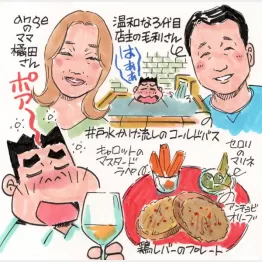この日の鶏レバーのプレート650円には、手作りのニンジンのマスタードラペ、アンチョビーオリーブ、セロリのマリネが添えられていて、どれもワインに合う、合う。2杯目は栃木県ココ・ファームのグラス1100円を。熟成されたコク深い味わいにすっかりイイ気持ちデス。