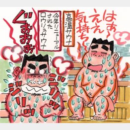 「昨年、板を張り替えました」とフロントマネジャーの恩田秀学さん。ヒノキ造りのベンチは上段ストレート、中段と下段はL字の3段で定員22人。大型遠赤外線ガスヒーターを正面に見る上段にどっこいしょ。設定は85~90度。ヒノキチオールたっぷりで香りがよく、無理なく10分堪能。
