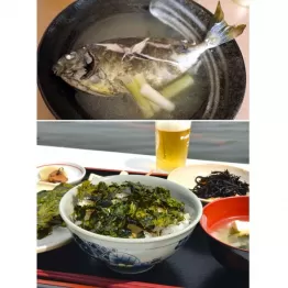昼近くなって「まるよし食堂」へ。名物は近辺で採取する、海藻のハバノリ定食1300円。一般に知られる海苔よりも磯香が強く、バリバリとした硬派な口触りが男好み。帰りは下戸の妻に運転してもらい、ビールで乾杯だ。女性には、ワカメのメカブとマグロの赤身をたたいて和えた海かけ丼1500円がおすすめ。どちらも女将手作りのおかずがたくさんついている。