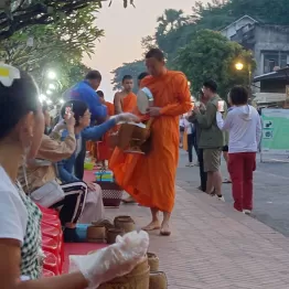 「伝統的な宗教儀礼の托鉢が圧巻です。毎朝5時半ごろ、夜明けとともにオレンジ色の装束をまとった僧侶たちが鉢をもって大通りを練り歩き、地元の人々がお米やお菓子などを喜捨していきます。その通りが夜になると、ナイトマーケットに一変。ランタンが町を彩り、250軒ほどが並び地元のモン族が作っている布製品、ラオスシルクなどが売られているのです」