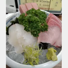 お通しのなめこおろしが素晴らしい。これだけで3合飲めるよ。目の前には宮沢賢治の写真の載ったメニューが置かれている。盛岡にいることを実感する還暦男。さて、つまみはどうするか。名物メンチカツや酢飯の代わりに山芋の千切りを使った鉄火巻き、セッタカレイの煮付けなどよだれモノばかり。しかし、ここはオススメの刺し身3点盛り(1600円=写真)と地酒で勝負だ。