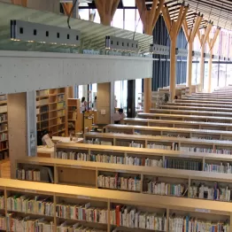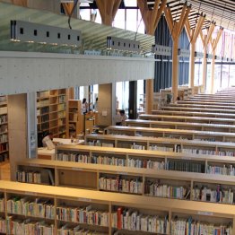 飯能市立図書館(埼玉県)館内に直径50cm、長さ10mの杉のみがき丸太が26本