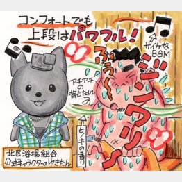 都電荒川線飛鳥山駅から歩いて5分ほど。ボクが生まれた1965年創業の「飛鳥山温泉」にお邪魔すると、下足場で北区浴場組合公式キャラクター“ゆきたん”がお出迎え。フロントに上がって2代目店主・小野塚辰幸さんの奥さま清美さんに入浴料+サウナ代900円を支払い、タオルセットとサウナ客専用ロッカーキーを受け取り、「ごゆっくり~」と見送られてイザ出陣!