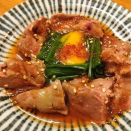 まずは生ビール(548円)とはらみ一本焼(300円)、オススメの生レバニラ(418円)から。豚はらみは歯ごたえのあるヒレ肉のようで、噛みしめると肉汁があふれ、うまいことこの上ない。低温調理した鶏レバーに湯通ししたニラと卵黄がトッピングされ甘めの醤油ダレがかかっている。これが絶品。白飯にぶっかけて食いたい衝動を抑えられない。なんでもつ焼き屋で鶏レバーなのか。小林店長に聞いてみた。