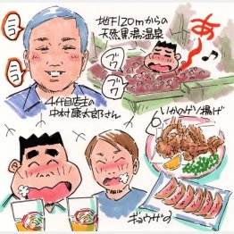 ステージではハワイアンな装いの年配熟女がご機嫌でカラオケを熱唱。客席のオジサンたちが「いよっ、お姉さん♪」と大盛り上がりっス。そんな様子を眺めつつ、ギョウザ500円、いかのゲソ揚げ550円を楽しみながら酒をグビッ。アットホームで地元感たっぷりなスパ銭並み温浴施設はイベントも大好評デス。(イラスト・文=太田由紀)