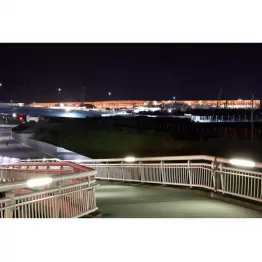そこからしばらく進むと、夢洲と舞洲を結ぶ夢舞大橋に着いた。橋を渡る途中、ふと後ろを振り返ると、万博会場の大屋根リングがライトに照らされ、大阪湾の暗闇に浮き上がっていた。橋の上は海風が吹き、ジメッとした湿気を吹き飛ばして気持ちがいい。キラキラと光る港湾地帯の夜景も一望できる。「歩くのもオツなものだ」と思ったが、これはまだ果てしなく長い道のりの序盤戦だったと、後で知ることになる。