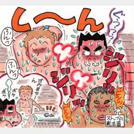 浴室の入り口近くのドアを開けると、正面にガス遠赤外線ストーブがドン。真新しい床板をガタガタ鳴らしながら、左手のストレート2段ベンチ上段にどっこいしょ。「床板や壁、ベンチはヒノキ造りで2年ほど前に張り替えました」と元気ハツラツの3代目・吉国義憲さん。定員6人の座面にはワッフル生地のふわふわマットが敷かれ、お尻が気持ちよかぁ。