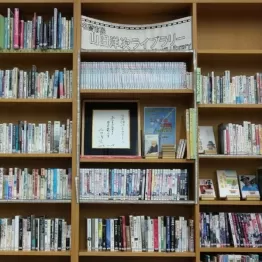 「豊中出身の山田監督に名誉市民が贈呈された2016年、特集架を設置しました。中央には『山田洋次ライブラリーへ 私生まれも育ちも 豊中岡町です 山田洋次 2016.10.15』と書かれた直筆の色紙を飾っています。山田監督作品のDVDや日本映画に関する本を含め約600タイトルを取り揃えています。DVDは昨年9月末時点で103枚。もちろん貸し出しており、やはり『男はつらいよ』シリーズが人気で、よく動きます。他の豊中市立図書館からも取り寄せ可能です」(山根副館長)