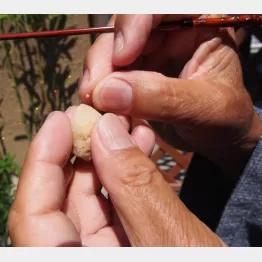 ポン太さんにレクチャーを受け、ユーマさんも練りエサを耳たぶの柔らかさに練り、ウズラの卵大に丸めて左手に持つ。右手では、箸を持つ要領で竿を手にしたまま、極小のタナゴバリをつまんで、丸めた練りエサの表面をひっかくようにしてハリ先に付ける。